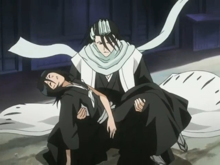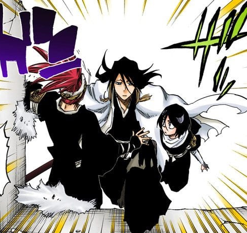 Rukia und Renji rennen durch die Trümmer, als Gerard plötzlich auf sie zustürmt; sie werden jedoch von Byakuya gerettet. Byakuya sagt ihnen, dass sie sich mit Ichigo treffen sollen, und Rukia widerspricht ihm, aber Byakuya sagt ihnen, dass Ichigos Reiatsu mit dem von Yhwach vergleichbar ist. Als Byakuya einen weiteren Angriff von Gerard abblockt, sagt er Rukia und Renji, dass er nicht sagt, dass Ichigo sie braucht, sondern dass er sie hier nicht braucht. Rukia und Renji danken ihm für seine Ehrlichkeit, während sie zum Palast laufen.[34]