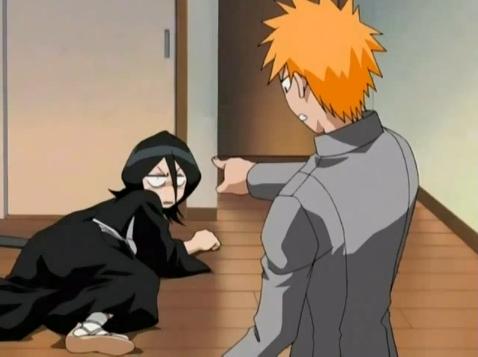 Rukia Kuchikis und Ichigo Kurosakis erstes Treffen verlief sehr unruhig, da es inmitten eines Hollow-Angriffes stattfand. In der darauf folgenden Nacht erschien Rukia erneut, jedoch dieses Mal bei Ichigo zu Hause da sie herausfinden wollte worauf der Hollow es abgesehen hatte. Dass Ichigo sie sehen und sogar treten konnte, verwundete sie dann allerdings doch sehr. Sie erklärte Ichigo was es mit den Shingami und den Hollow auf sich hat und kurz darauf wurde Ichigos Familie von dem Hollow Fishbone D angegriffen. Rukia versuchte zwar gegen diesen zu kämpfen doch mischte sich Ichigo in den Kampf ein. Nachdem sie von dem Hollow schwer verwundet wurde, beim Versuch Ichigo zu beschützen, ist sie gezwungen, ihre Shinigamikräfte auf Ichigo zu übertragen, damit er sie, sich selbst und seine Familie retten kann. Zwar wollte sie Ichigo nicht all ihre Kräfte geben doch passierte genau das.