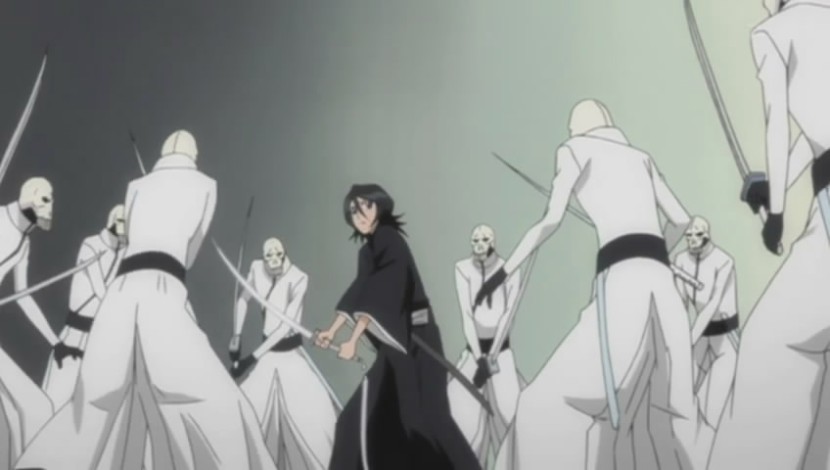 Als Ichigo es endlich schaffte Ulquiorra Cifer zu besiegen und Orihime aus deren Gefangenschaft zu befreien, kam jener seinen Freunden zur Hilfe und brachte so auch Rukia, die drohte auf dem Boden auf zu schellen, nachdem der große Espada sie niedergeworfen hatte, in Sicherheit. Sofort bemerkte Rukia die Veränderung an Ichigos Maske und stellt sich die Frage, was während dessen Kampfes auf der Kuppel von Las Noches vorgefallen war. Ichigo wurde dann von Kenpachi und Byakuya abgelöst, um in die Soul Society zurück zu kehren um es dort mit Aizen aufzunehmen. Die beiden unterschiedlichen Kommandanten kümmerten sich daraufhin um Yammy, während Rukia erneut geheilt wurde.