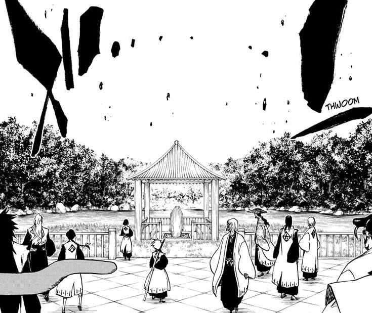 Rukia und die anderen Kapitäne bemerken Jigoku no Rinki in der Nähe von Ukitakes Grab