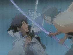 Rukia warnt Byakuya, Augenkontakt mit Äs zu vermeiden, als er seine Kraft erneut entfesselt. Doch der Angriff wird von Byakuya leicht abgewehrt. Während er beobachtet, wie Äs vor Wut tobt, macht Byakuya Rukia ein Kompliment, weil sie stärker geworden ist, was Rukia zu einer Träne veranlasst. Er ermutigt sie weiter, indem er ihr sagt, dass sie nichts zu befürchten hat, und überlässt ihr damit den Kampf. Rukia entfesselt ihr Bankai, und eine blendende weiße Säule entsteht.[10] Als Äs fest gefroren ist und verblasst, steht Rukia in ihrer Bankai-Form, als ein Riss auf ihrem Handrücken erscheint. Byakuya tritt vor und sagt ihr, sie solle langsamer werden, während sie wieder auf Normaltemperatur kommt. Während er ihr Bankai lobt, erklärt Byakuya Rukia, dass sie es sehr gut kontrollieren muss, um sich selbst nicht zu verletzen, und erinnert sie daran, dass eine Klinge, die auf Kosten des Lebens des Trägers geführt wird, nichts schützen kann. Sie gehorcht Byakuya und geht mit ihm weiter.[11]