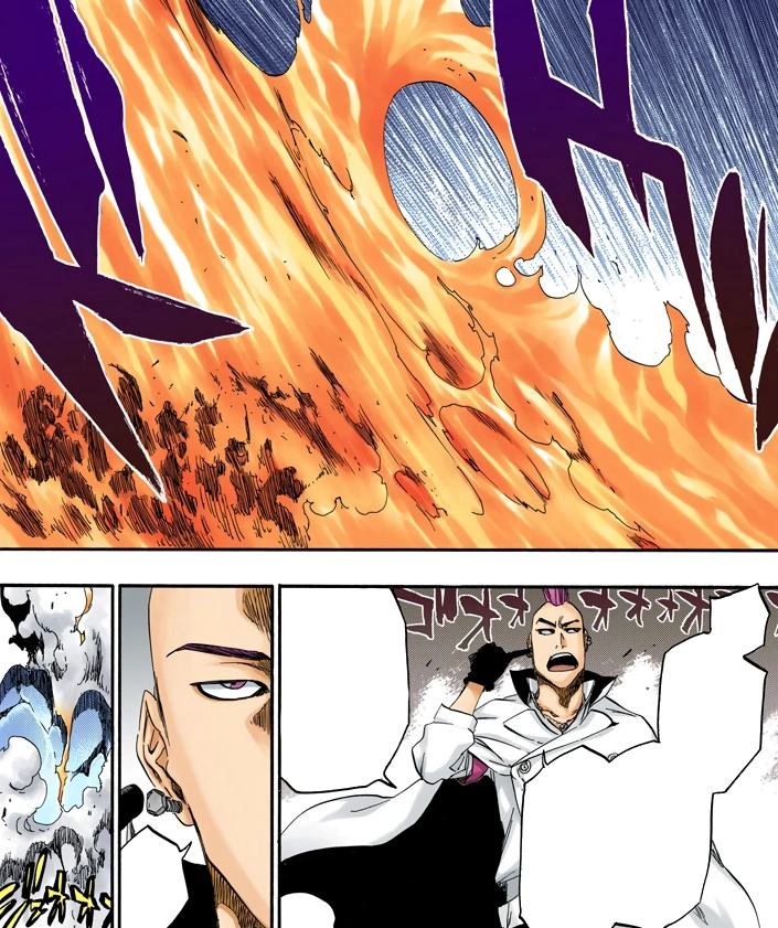Bazz-B atacando a un grupo de shinigami con sus llamas