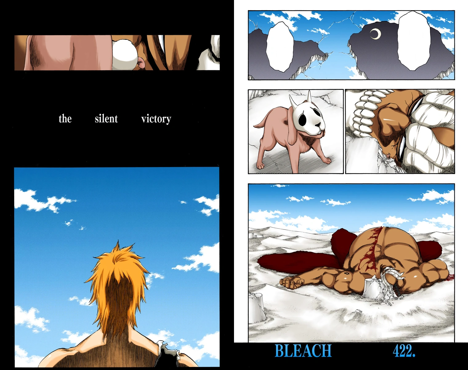 Entonces, Byakuya y Kenpachi llegan de regreso de su lucha con Yammy en Hueco Mundo. Los miembros de sus escuadrones le dan bienvenida, y peticiones de ayudas médica para los dos capitanes. La 11 ª División se pregunta cómo la lucha fue en esta ocasión, y Kenpachi dice "demasiado aburrido". En Hueco Mundo, se observa el cuerpo de Yammy al lado de un edificio destruido. El Perro Hollow de hace mucho tiempo vuelve, Yammy lo mira y pregunta: "¿Por qué vuelves, perro estúpido ..." Con eso, Yammy Llargo muere. De vuelta en la Sociedad de Almas, donde la lucha de Ichigo se llevó a cabo. Ichigo está mirando hacia el cielo, Ichigo le pregunta a Urahara donde esta todo el mundo. Urahara dice que todos ellos se fueron a casa, y que querían hablar con Ichigo, pero parecía difícil debido a lo ocurrido. Ichigo le pregunta si sus recuerdos fueron sustituidos, Urahara le dice que no. Ichigo dice bueno, y que quiere explicarles a ellos con sus propias palabras. Urahara anuncia que el sello de Aizen fue transportado al Seireitei, donde la central 46 es decidirá que será de Aizen. Ichigo dice "ah", y luego mira hacia abajo. Urahara le pregunta por qué él está haciendo una cara tan triste, y Ichigo mira hacia arriba con sorpresa. Él dice que él se está preguntando algo. Urahara le dice que salvó a la ciudad de Karakura derrotando a Aizen y arriesgando su propia vida. Ichigo se sienta en una roca y no responde. Ichigo le pregunta Urahara si Aizen realmente fue rechazado por el Hogyoku. Su padre le había dicho acerca de la Hogyoku y que su capacidad de ver los deseos de el "corazón" a su alrededor y materializarlos. Pero si eso es así, entonces Aizen podría haber querido perder ese poder. Luego Ichigo dice que él había logrado adquirir la cantidad necesaria de energía para derrotarlo, y él finalmente lo habia logrado igualar en la batalla. Ichigo dice "En la espada de Aizen era sólo soledad lo que senti". Ichigo piensa que Aizen estaba buscando una persona con el mismo punto de vista del mundo al del, y que muy en el fondo Aizen seguía deseando solo ser un Shinigami mas.