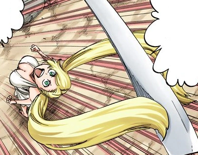 Después de que Mera respira fuego para iniciar el proceso de forjado de la zanpaku-tō, Hasuka empuja con sus dos coletas al Asauchi de Ichigo para enfriarla y luego la vuelve a sujetar.