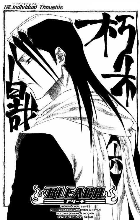 A la caserne de la 7ème Division, Tetsuzaemon Iba, le vice-capitaine s’excuse auprès de son capitaine, Sajin Komamura, d’être en retard car il s’est endormi dans les toilettes. Cependant, Komamura lui dit que tout va bien, qu’il est prêt et qu’il n’a pas besoin de lui trouver des excuses pour lui donner plus de temps, ce qu’Iba nie. Mais Komamura lui dit qu’il sait qu’il est inquiet à propos de la légitimité de l’exécution. Et pour donner à Komamura assez de temps pour y réfléchir, i est arrivé volontairement en retard, ce qu’Iba confirme. Komamura déclare qu’il n’a plus de doute, que sa loyauté va seulement à Genryūsai-sama car il l’a accepté alors que tout le monde le repoussait à cause son apparence. Il se doit alors d’honorer sa dette même s’il doit pour cela être taillé en pièces. Si sa Grandeur dit "oui", alors, même s’il était mort, il dirait "oui". Il demande alors à Kaname Tōsen, le capitaine de la 9ème Division, quel est son sentiment. Ce dernier répond qu’il restera fidèle à cette voie. Ce chemin qu’il a choisi avec ses yeux aveugles sera celui qui ne sera jamais teinté du rouge du sang. Il croit qu’il va prendre le même chemin que Komamura.