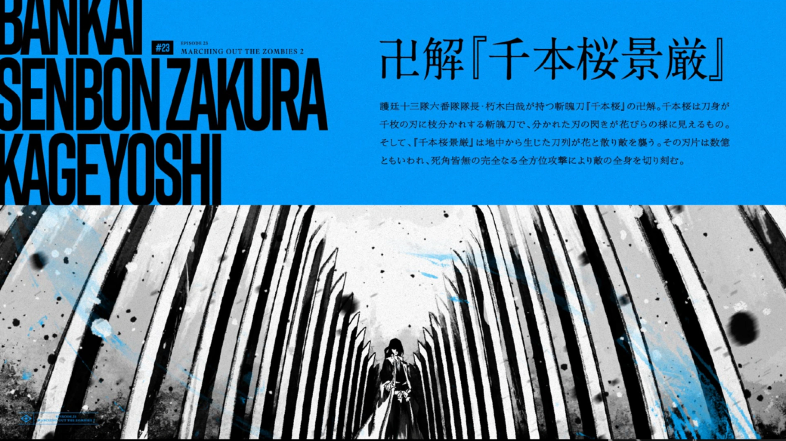 Et dans "Senbonzakura Kageyoshi", une rangée d'épées créées à partir du sol se disperse en fleurs et attaquent l'ennemi.