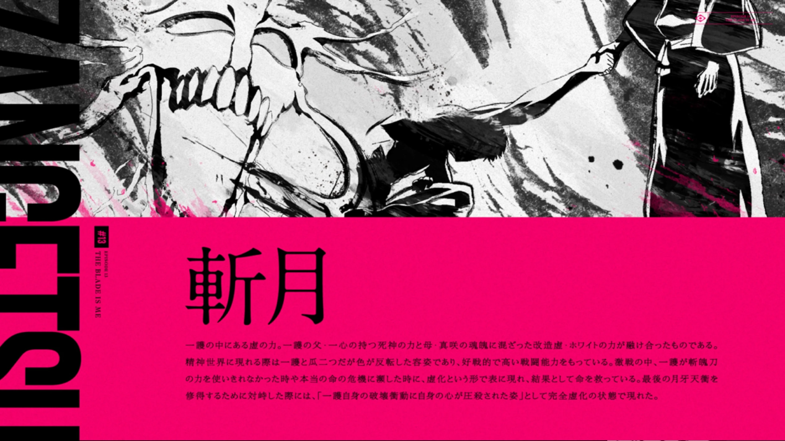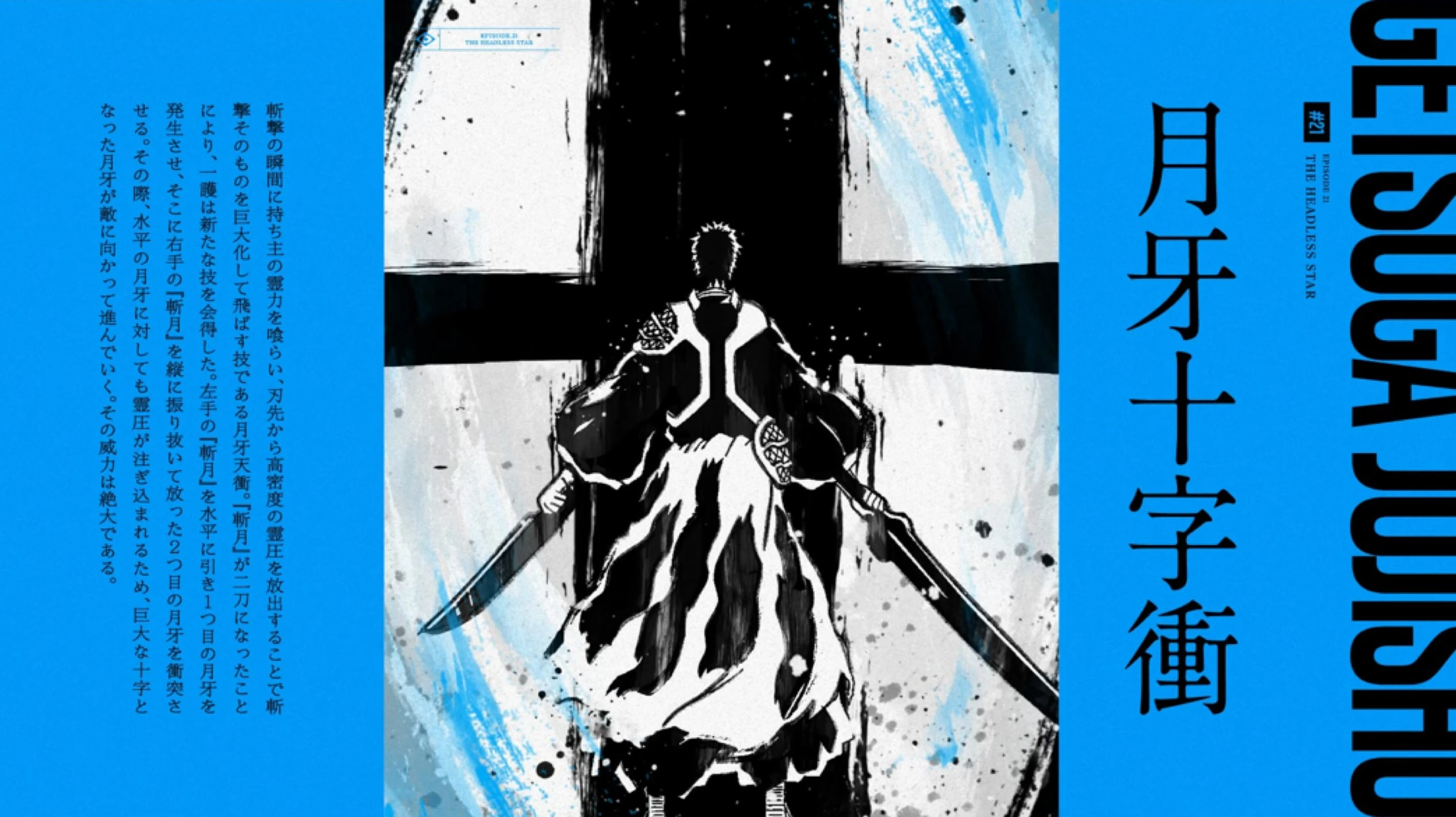 En tranchant avec "Zangetsu" de la main gauche horizontalement, il génère le premier Getsuga, puis en tranchant avec "Zangetsu" de la main droite verticalement, il génère le second.