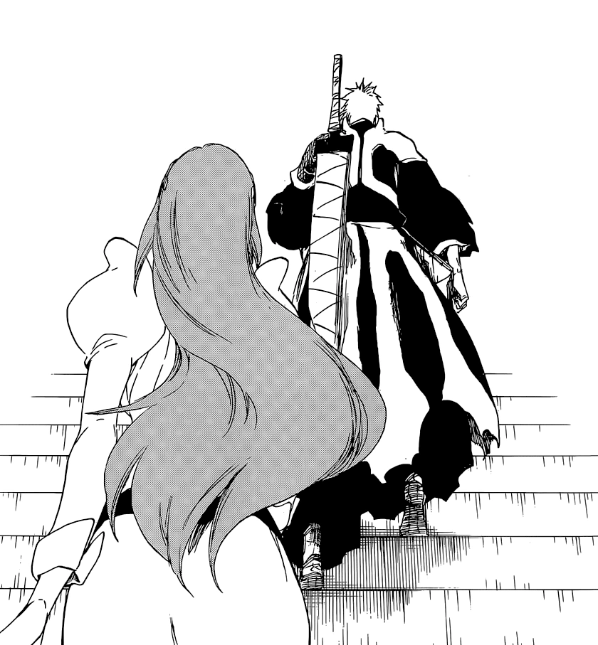 Przed drzwiami do pokoju Yhwacha, Ichigo i Orihime zatrzymują się. Nastolatek pyta się dziewczyny, czy to czuje, na co ona przytakuje. Dopowiada, że to zza tych drzwi. Komentuje, że walka jeden kontra dwa jest nieuczciwa, więc prosi Orihime, aby została z tyłu i mówi, żeby go nie zawiodła. Inoue wspomina przeszłość. Stwierdza, że ostatecznie jest w stanie stanąć u jego boku. Ichigo otwiera drzwi i stoi przed Liderem Wandenreich. Yhwach stwierdził, że czekał na przybycie swojego syna ciemności.[1]