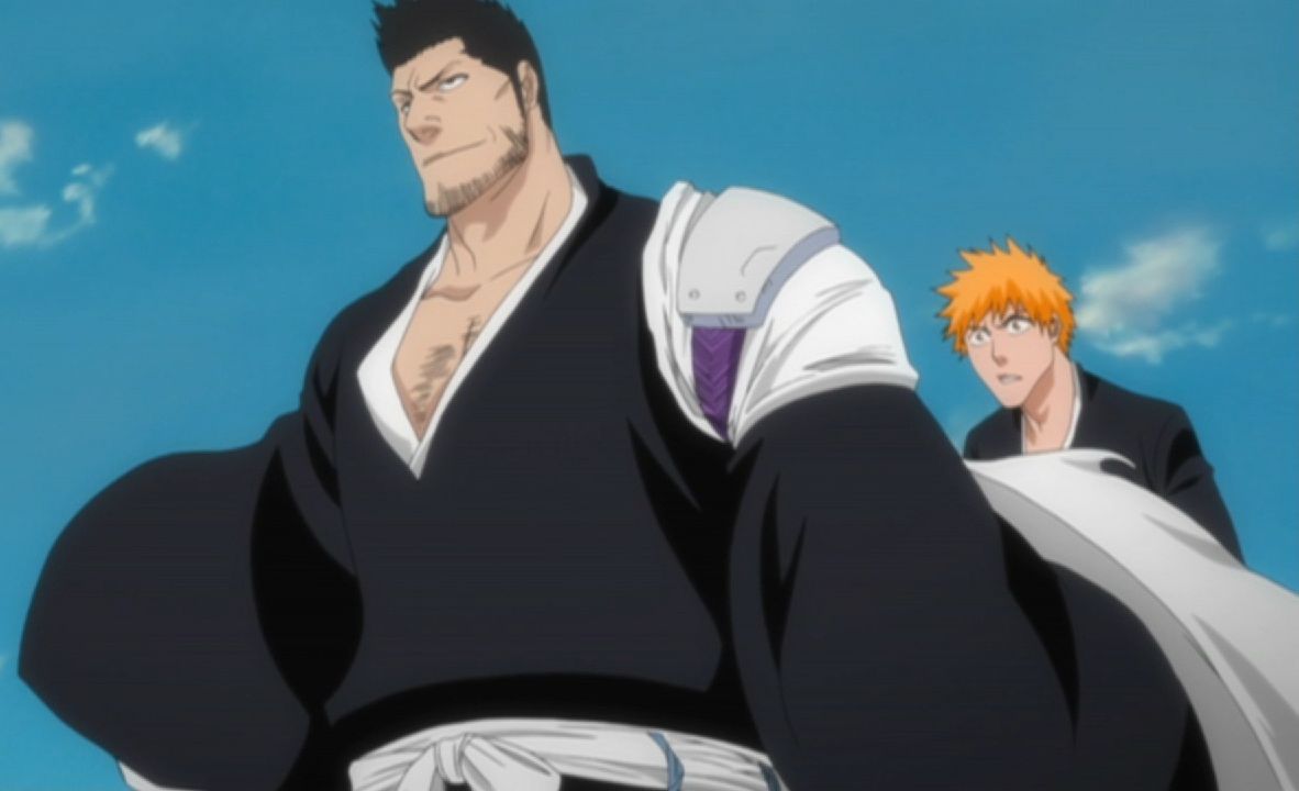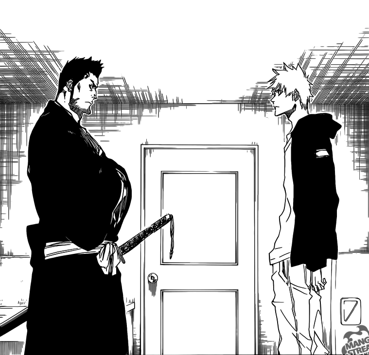 Isshin, w stroju Shinigami, stoi przed Ichigo