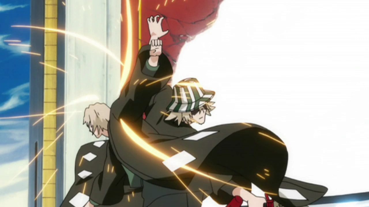 Kisuke na chwilę unika kopnięcia Hiyori, jednak ostatecznie pozwala jej się kopnąć