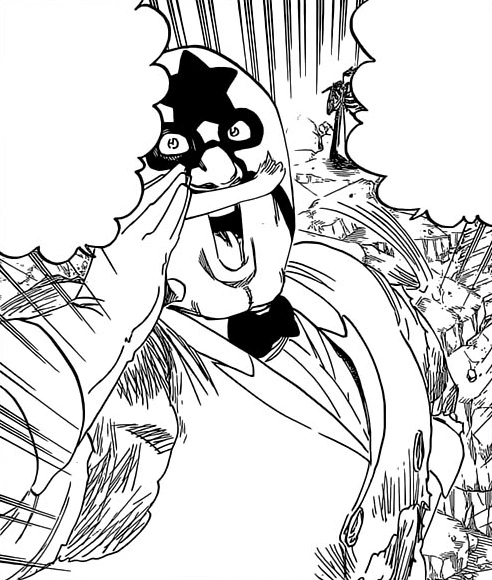 Strumień krwi wytryskuje z rany znajdującej się tuż nad pasem zamaskowanego mężczyzny. Wydaje się on bezwładnie upadać na ziemię. Abarai odbiera to jako wyraźny znak, że walka została zakończona. Wówczas jednak, ku kompletnemu zaskoczeniu Renjiego, Mask zamyka swoją ranę i kontynuuje pojedynek. Sternritter mamrocze pod nosem chwilę, o tym, iż nie da się pokonać łajdakowi pokroju jego obecnego przeciwnika, po czym pyta o potwierdzenie swojego poćwiartowanego kamrata. Ten, pomimo swojego tragicznego stanu odpowiada na wezwanie swego mistrza. Kilka sekund później z fragmentów jego ciała zaczynają wychodzić jego miniaturowe repliki, które podobnie jak pierwowzór, do utraty tchu dopingują Maska.[5]