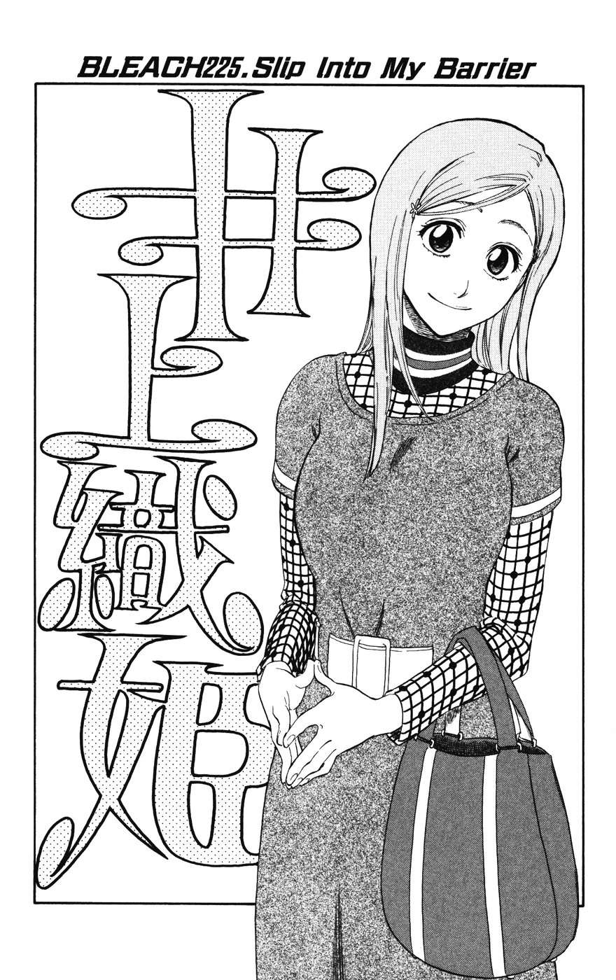 Za śladami Reiatsu Ichigo, Orihime znajduje siedzibę Visoredów. Z zachowania kota i ptaków wnioskuje, że zwierzęta nie mogą zbliżyć się do budynku. Spogląda na barierę, która wymazuje obecność tego miejsca ze świadomości otaczających go istot, a następnie wyciąga rękę, by jej dotknąć. Po chwili wyczuwa podobieństwo zapory do jej własnych umiejętności i przechodzi przez nią.