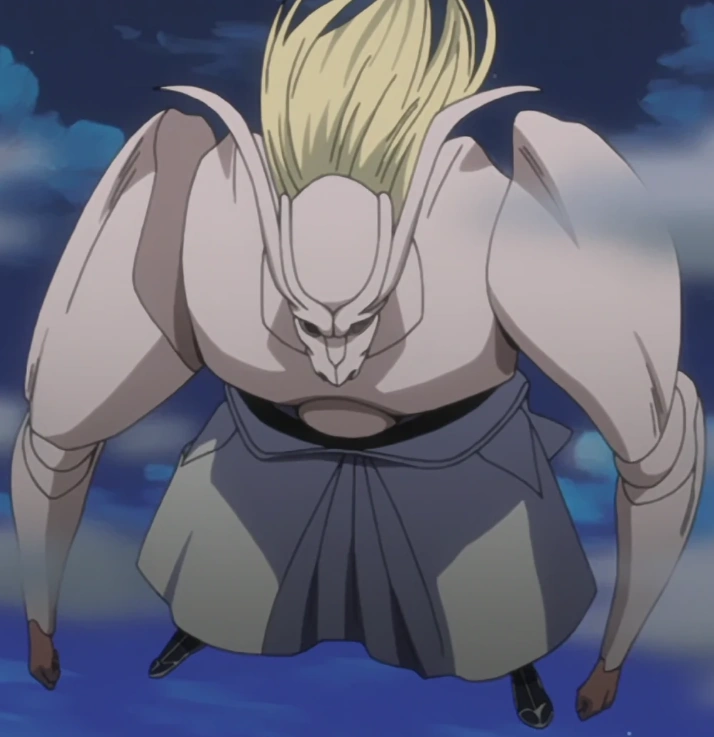 - Resurrección: Komendą uwalniającą jest Ubodź go/ją (突き砕け, tsukikudake). Po uwolnieniu górna część jego ciała powiększa się i jest pokryta zbroją w kształcie głowy, a jego maska wydaje się całkowicie zregenerować siły i dać mu dwa, cienkie rogi. W tej formie jest czworonożny i używa swoich rogów do powitania przeciwnika.[16]