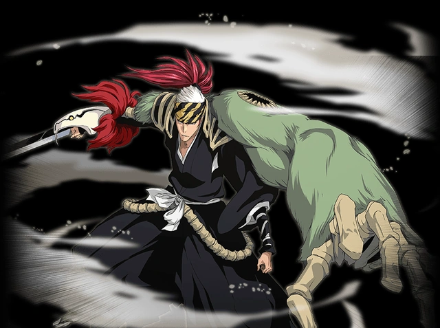 : Истинная форма банкая Ренджи приобретает более компактную форму, которая преимущественно изношена. На правом запястье Ренджи получает перчатку, напоминающую верх черепа змеи, с капюшоном из красного меха. Длинный костяной хвост, состоящий из позвоночных структур, выступает из задней части черепа, тянется позади него и обернут вокруг его талии, как свободный пояс. По желанию, Ренджи может расширить большое лезвие изо рта змеи. Ренджи также получает большой капюшон из лёгкого меха, который свисает с его левого плеча. Кроме того, он получает пару оплечий, которые образуют бронированный воротник, а также дополнительные позвоночные шнуры, которые свисают с его талии.[58]