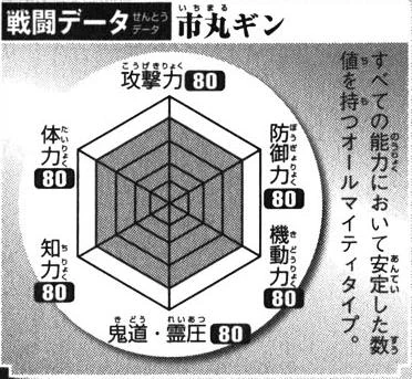 Gin's Battle Data, clockwise. Top: Offense (80), Top Right: Defense (80), Bottom right: Mobility (80), Bottom: Kidō/Reiatsu (80), Bottom Left: Intelligence (80), Top Left: Physical Strength (80). Total: 480/600.