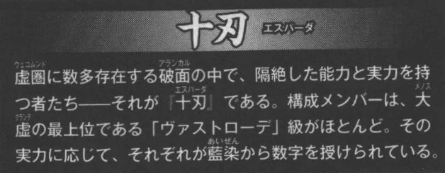 Weko Mundo ni suuta sonzaisuru Arankaru no naka de, kakuzetsushita nouryoku to jitsuryoku wo motsumonotachi-----sore ga "Esupāda" de aru. Kousei menbā ha, Menosu Gurande no saijoui de aru "Vasuto Rōde" kyuu ga hotondo*. Sono jitsuryoku ni oujite, sorezore ga Aizen kara suuji wo sazukerarete iru.