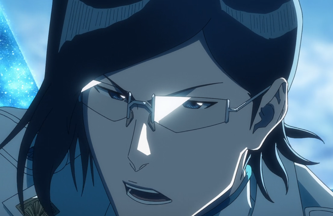 A gigantic column of crackling blue flames fills the air above the city, forcing Ichigo to move much further into the air with Shunpo, before condensing into an even larger instance of Qual Kreis with Yhwach standing behind the Heilig Bogens. Frantically blocking the subsequent barrage of giant Heilig Pfeil, Ichigo eventually cuts through them with a Getsuga TenshĆ and rushes toward Yhwach, who simply reappears behind him every time Ichigo attempts to attack him and states that he can clearly see Ichigo's every move. As he laments Ichigo's inability to see the difference in their power, Yhwach grabs Ichigo by the face.[7]
