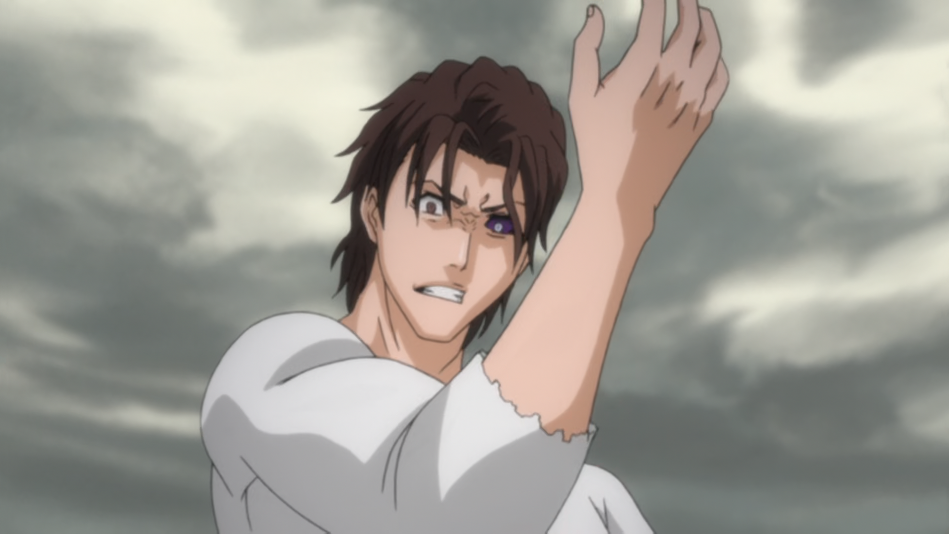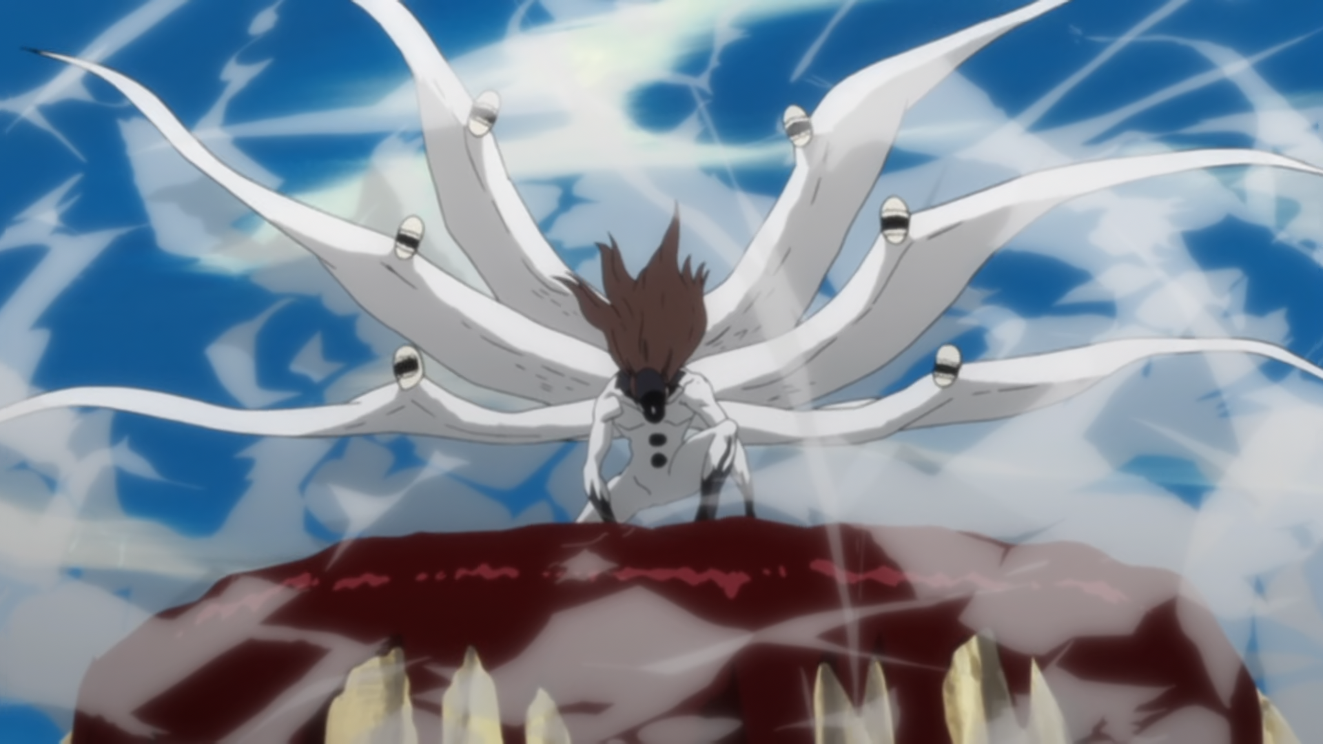 Ichigo lands a strike across Aizen's torso, but Aizen instantly backs away in a flash of light from him to a nearby cliff. Ichigo tells him that it's a strange feeling: when he put distance between them Aizen asked him why and now it is Aizen who is creating the distance. Ichigo then asks Aizen the same question. Aizen's wound begins to heal as he asks Ichigo if he liked that he had stopped his sword or if he is happy that he destroyed his Kidō and if he is happy he injured his body. He then becomes enraged and yells at Ichigo to abandon his Human arrogance. The diamond shape on Aizen's forehead opens up and develops into something similar to a horizontal third eye, as Aizen transforms again into what looks like a Hybrid Arrancar creature with multiple wing-like appendages, which have Hollow skulls attached to the ends. After which, Aizen states that he now sees the Hōgyoku will not truly allow him to lag behind a Human. One of the Hollow skulls fires a small spiritual energy blast which has a devastating impact that can be felt all the way in Karakura Town, and creates a large crater where it hit. Ichigo survives the blast, but it destroys the upper half of his Shihakushō and singes his left arm he used to block the blast. Aizen says he sees that taking that attack only partially burned Ichigo, but that his left arm is most likely useless to him now.