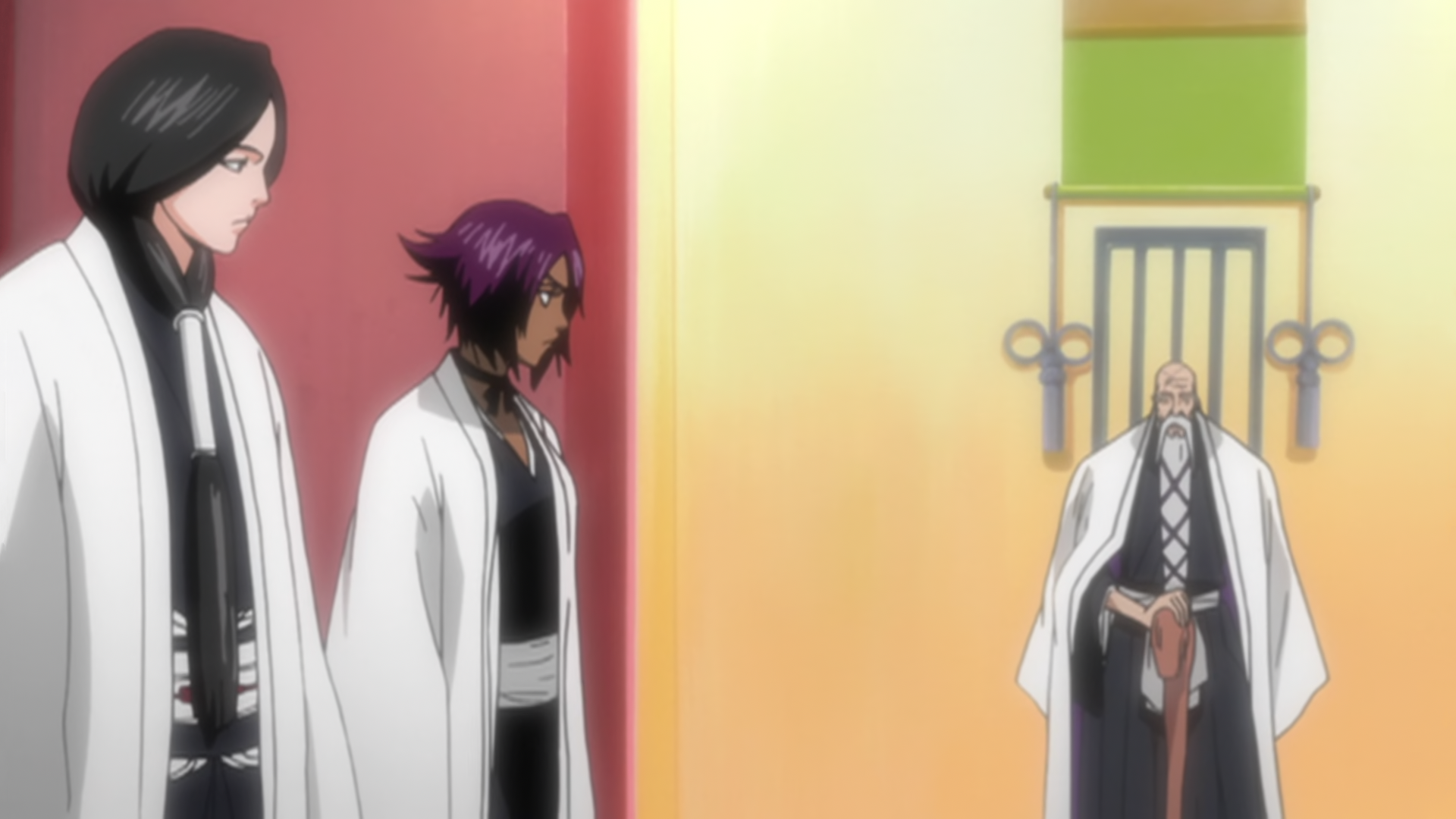 Yamamoto, along with Byakuya and Ukitake, is told Rukia and Renji Abarai have disappeared, and the Second Division is looking for them all throughout the Seireitei.[56]