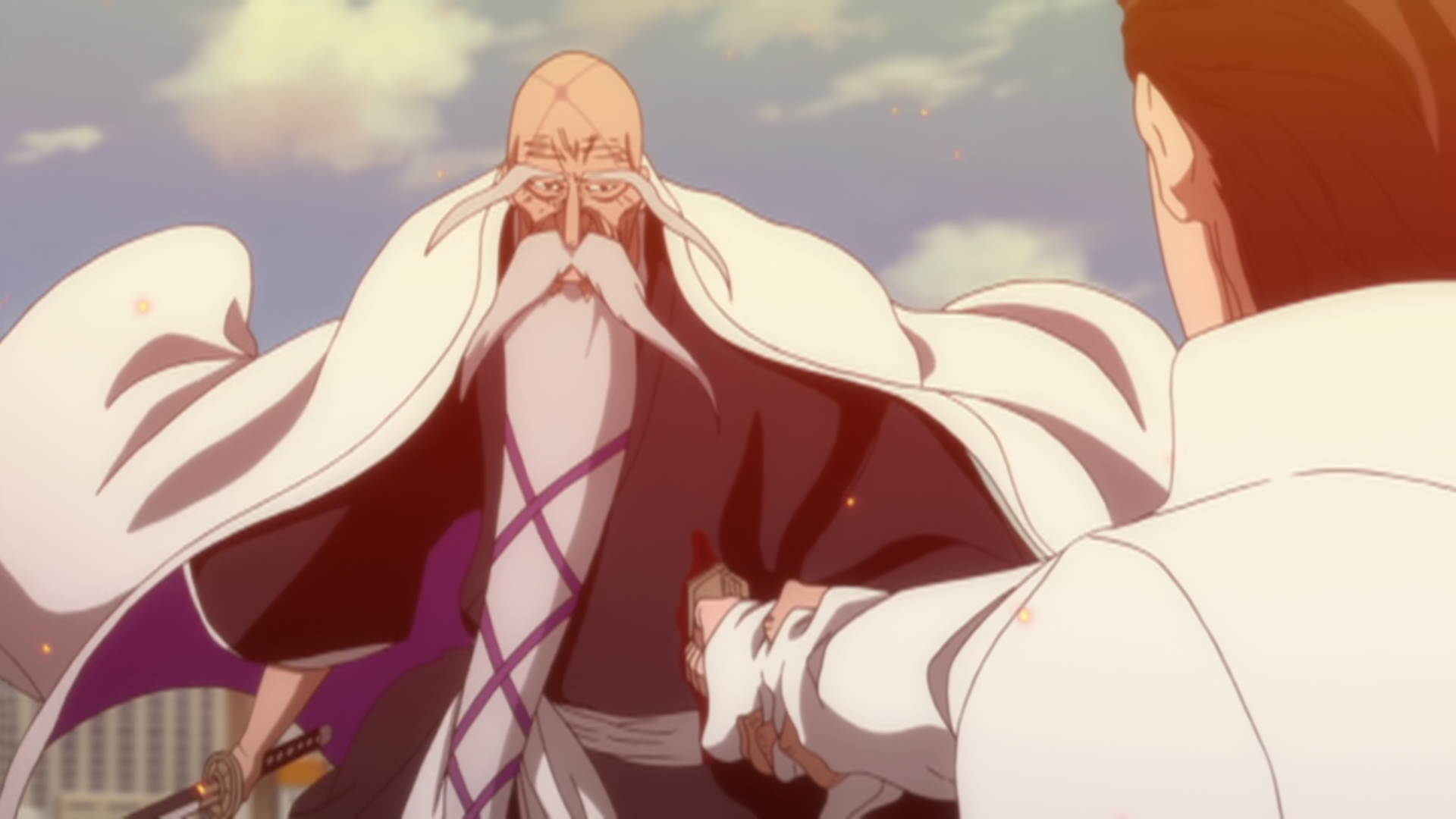 Yamamoto is present during a meeting between captains over their fellow Captain Gin Ichimaru's failure to kill Ichigo Kurosaki. Upon arrival, Gin gets into an argument with 11th Division Captain Kenpachi Zaraki and 12th Division Captain Mayuri Kurotsuchi. Telling them to stand down, Yamamoto, asking Gin if he has been told why he has been summoned, details how Gin acted without permission and failed to capture or kill the target, which he feels is unusual for a captain, and asks for an explanation.[37]