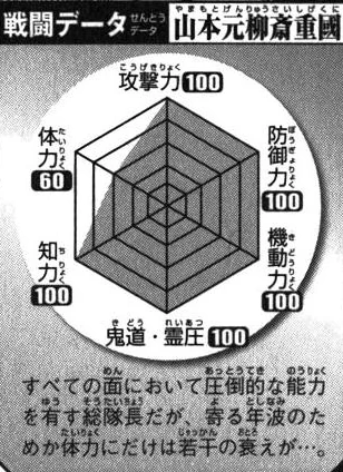 Immense Strength: In addition to his surprisingly muscular physique for his age, Yamamoto possesses tremendous physical strength. He easily and swiftly put a large hole into the chest of the monster Ayon without much effort at all, using only the blunt end of his cane. With a single hand, he stopped one of Ayon's strikes and overpowered it, despite it having enlarged its arm and increased its strength several folds.[125] With one punch, he put a large hole through the chest of Wonderweiss Margela while he was in Resurrección and sent him flying back several city blocks.[23] He tore off Wonderweiss' arms, with his bare hands, with little to no effort.[126] With a single double-fisted strike, he shattered Wonderweiss' entire body into pieces.[127]