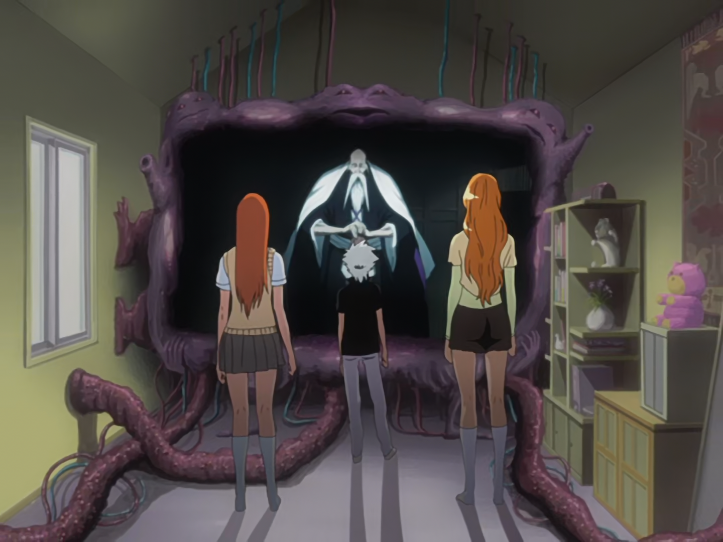 Yamamoto speaking with Tōshirō Hitsugaya, Rangiku Matsumoto, and Orihime Inoue.