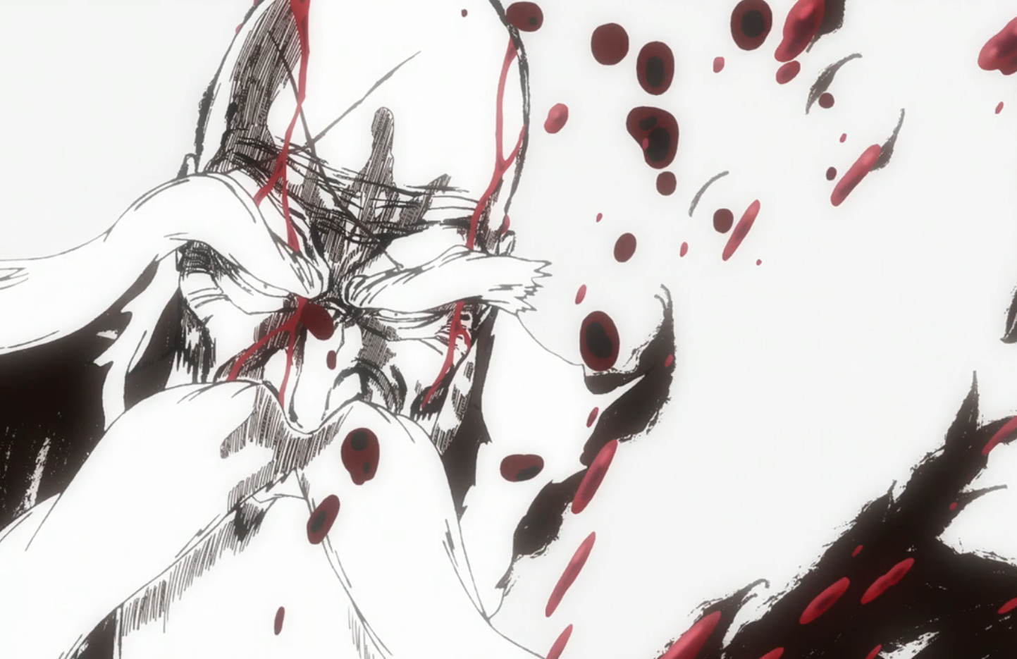 Yamamoto is diagonally slashed through by Yhwach's Reishi Broadsword.