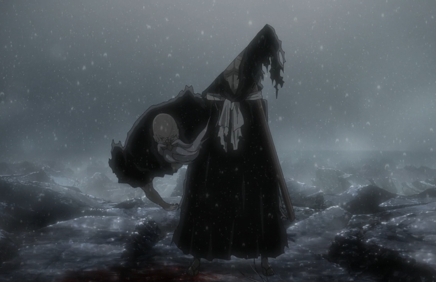 Cut diagonally in half by this attack, Yamamoto coughs up blood while his top half falls to the ground. With the rain continuing to fall heavily across the Seireitei, Yhwach looks down disdainfully at Yamamoto's motionless body and asserts that his demise was pitiful despite his station as the Captain-Commander. However, when Yhwach attempts to leave with Jugram Haschwalth, he is stopped by Yamamoto grasping his leg with his remaining arm, prompting Yhwach to sever his hand after a brief pause and assume that this was Yamamoto's attempt to demonstrate that he will not allow Yhwach to get away even in death.[9]
