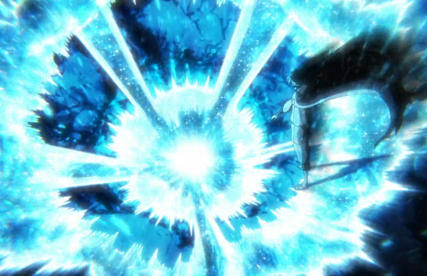 Yhwach is startled by an explosion occurring in the sky behind him as Ichigo Kurosaki arrives.