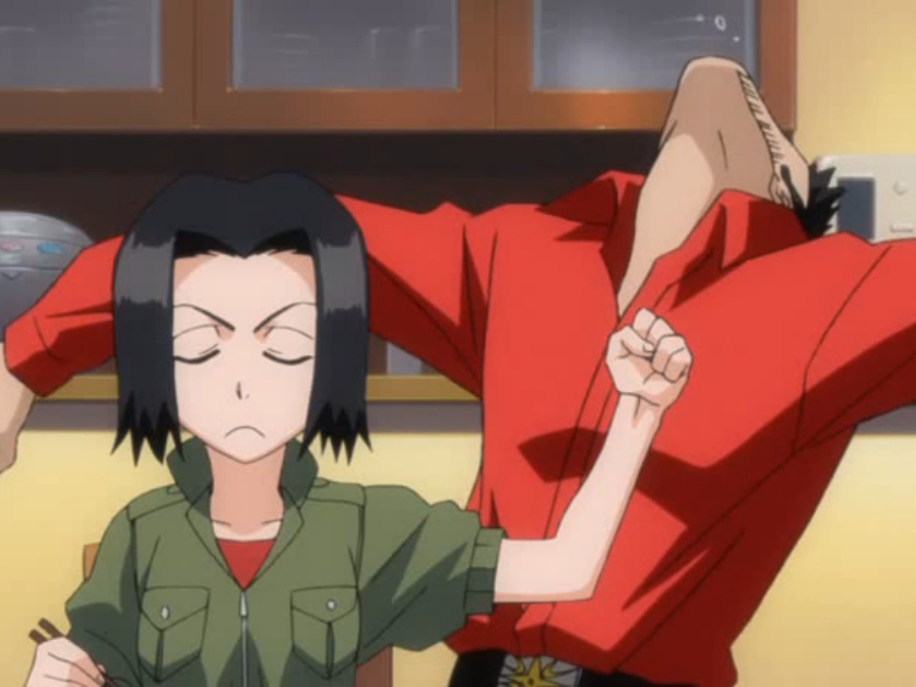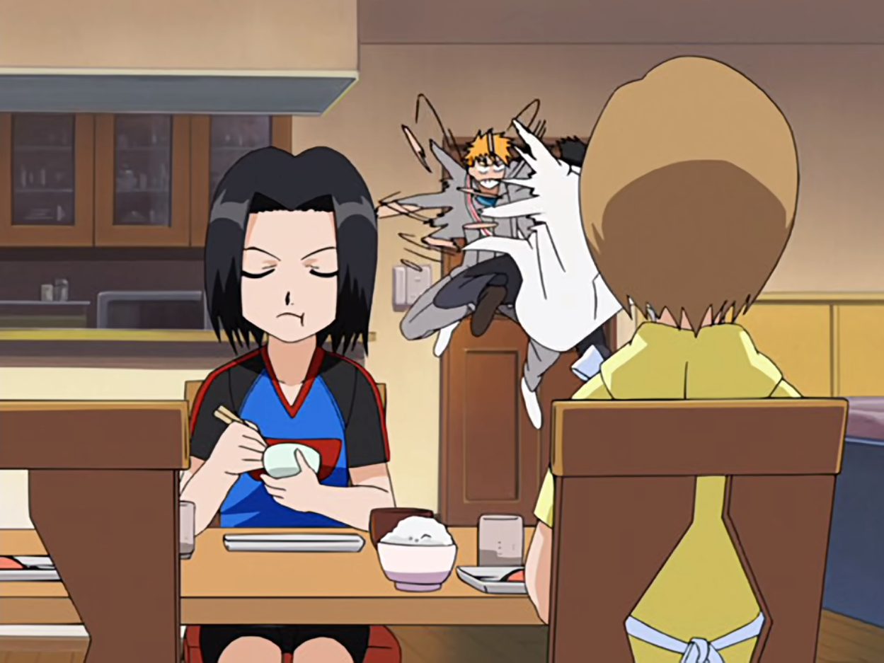 When Ichigo and Isshin are fighting upstairs, Yuzu calls them down for breakfast and Karin wonders what they're doing now. As they're eating, Yuzu asks Isshin for an explanation as to what happened to his face and Isshin simply turns around saying nothing happened. Karin then asks Ichigo if he's been working out lately since he's built up a few muscles lately. Ichigo changes the subject though and asks Yuzu and Karin if they've been doing their homework. Yuzu states that she got it done in hardly any time at all and then Karin states that Don Kanonji has been coming over a lot, saying that Ichigo is now his pupil. Ichigo begins to get worried and tells them that Kanonji doesn't know what he's talking about. All of a sudden Isshin gets up from his chair and kicks Ichigo in the face, sending him backwards. Isshin mocks Ichigo for not being able to react fast enough and the two of them begin fighting. Yuzu then tells them to stop fighting at the table. Later, after Ichigo returns home from school, Karin greets him and Yuzu tells him he's just in time for dinner. However, Isshin immediately begins fighting with Ichigo again, telling him he's late. Yuzu tries to stop this but Karin tells her to leave them alone and to think of it as a bonding experience for the two of them.[56]