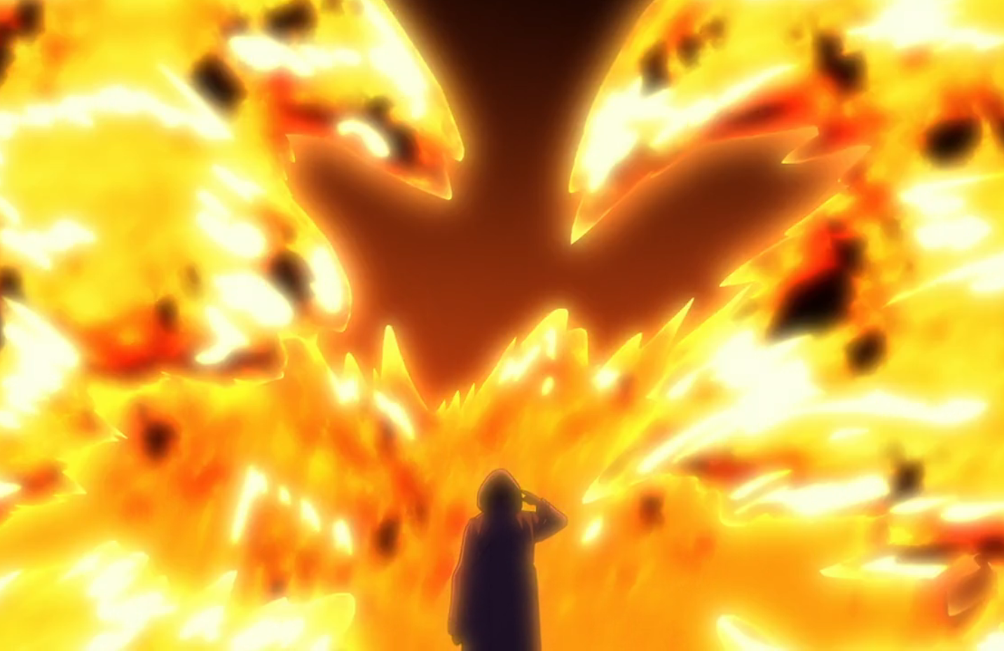 However, even with Gremmy claiming that the only outcome is himself being left alive after the meteor lands and kills everyone else, which he calls a hopeless situation, Kenpachi merely looks up at the meteor with unrestrained glee, counters that Gremmy is the one who cannot do anything about this, and launches himself into the air toward the meteor before releasing his Shikai, Nozarashi. Down on the ground, Yachiru watches this and recalls meeting Kenpachi for the first time as an infant, where Kenpachi saw that she was not afraid of his sword and realized that she had no name just like him. Up above, Kenpachi cuts completely through the center of the meteor, splitting it in half and causing the two halves to explode outward into thousands of small chunks that rain down across the Seireitei, forcing Gremmy to shield himself. In the air above Gremmy, Kenpachi stands with Nozarashi resting on his shoulder.[21]