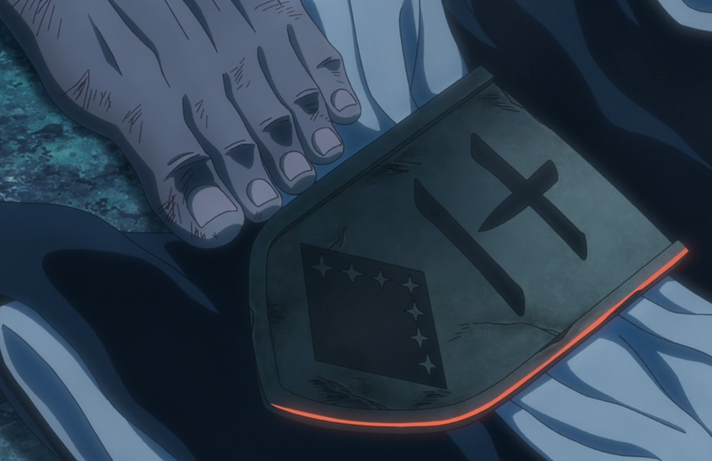 Kenpachi discovers Yachiru's shihakushō and lieutenant's badge lying on the ground.