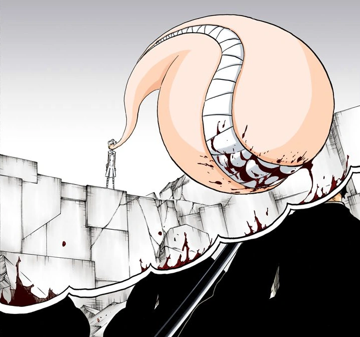 With Gremmy realizing that his momentary lapse of concentration will leave him late to heal and open to Kenpachi's next attack, Kenpachi comes down and slashes him diagonally again. Left heavily bleeding and in disbelief by this, Gremmy internally questions why he cannot stop Kenpachi's blade and considers the possibility of losing to him, which he repeatedly and vehemently denies being possible. Upon noticing Gremmy's state and feeling less resistance to his attacks, Kenpachi stops his assault and asks Gremmy if he just envisioned himself losing, which causes Gremmy to realize what is happening and heal his wounds before thanking a confused Kenpachi for helping him wipe away all thoughts of death and ensuring he can no longer die.[18]