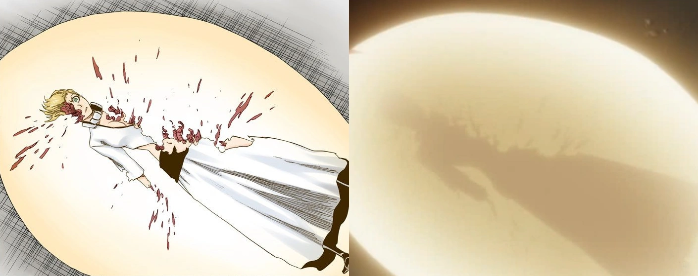 Following her initial death at Grimmjow's hands, Menoly is healed by Orihime's Sōten Kisshun. However, this particular moment is portrayed differently between the manga and anime. In the manga, her innards are seen reformed,[27] whereas in the anime Menoly's body is completely obscured by Sōten Kisshun.[25]