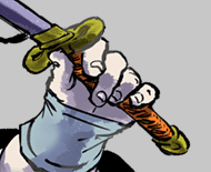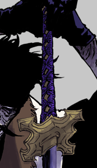 In its sealed form, Chigiri's Zanpakutō took the form of a katana with a purple handle, a rectangular silver tsuba, and a purple scabbard.[5]