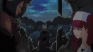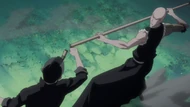 Moe manages to regain consciousness and grabs Ikkaku's leg, refusing to let the fight end. Ikkaku tells Moe to not pointlessly throw away his life, but Moe says that he already gave his life to Tsukishima. Ikkaku asks if Tsukishima is just as willing to die for Moe. Moe hesitantly says it doesn't matter. Ikkaku calls him a fool, saying that pointlessly throwing his life away for someone that doesn't respect him is the act of an attention-seeking brat. While Ikkaku says he will strike Moe down with all his force, he asks Moe if he is sure Tsukishima is really worth dying for, to which Moe shows even more doubt.[19] Ikkaku continues to lecture Moe before he finally heads off.[20]