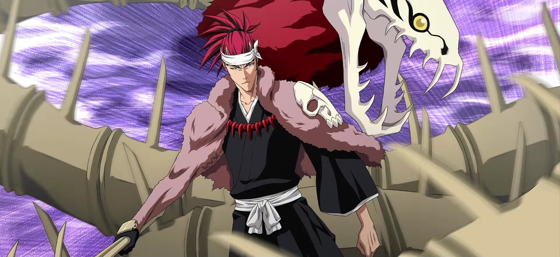 Hihiō Zabimaru. Hihiō Zabimaru (狒々王蛇尾丸, Baboon King Snake Tail; Viz "Baboon King"): Renji's Bankai transforms Zabimaru into a massive version of its Shikai form, resembling a skeleton of a snake. Zabimaru gains many more, much larger segments, resembling a mix between a snake’s vertebral column and the pick-like protrusions of his Shikai segments. It also gains a snake-like head about the size of a small car. Renji is also slightly transformed, gaining a fur cowl around his neck. The cowl appears to be the fur of an ape, and the ape's skull can be seen over Renji's left shoulder, while the rest of the fur extends to cover his right arm. Zabimaru itself, in Bankai form, does not cut like its Shikai does; Renji usually catches his opponent with the snake-head of his weapon and smashes his opponent into the ground with it. The head is capable of inflicting heavy damage through biting.[225] Mayuri Kurotsuchi states that the segments broken during Renji's fight with Byakuya Kuchiki have been missing ever since.[226]
