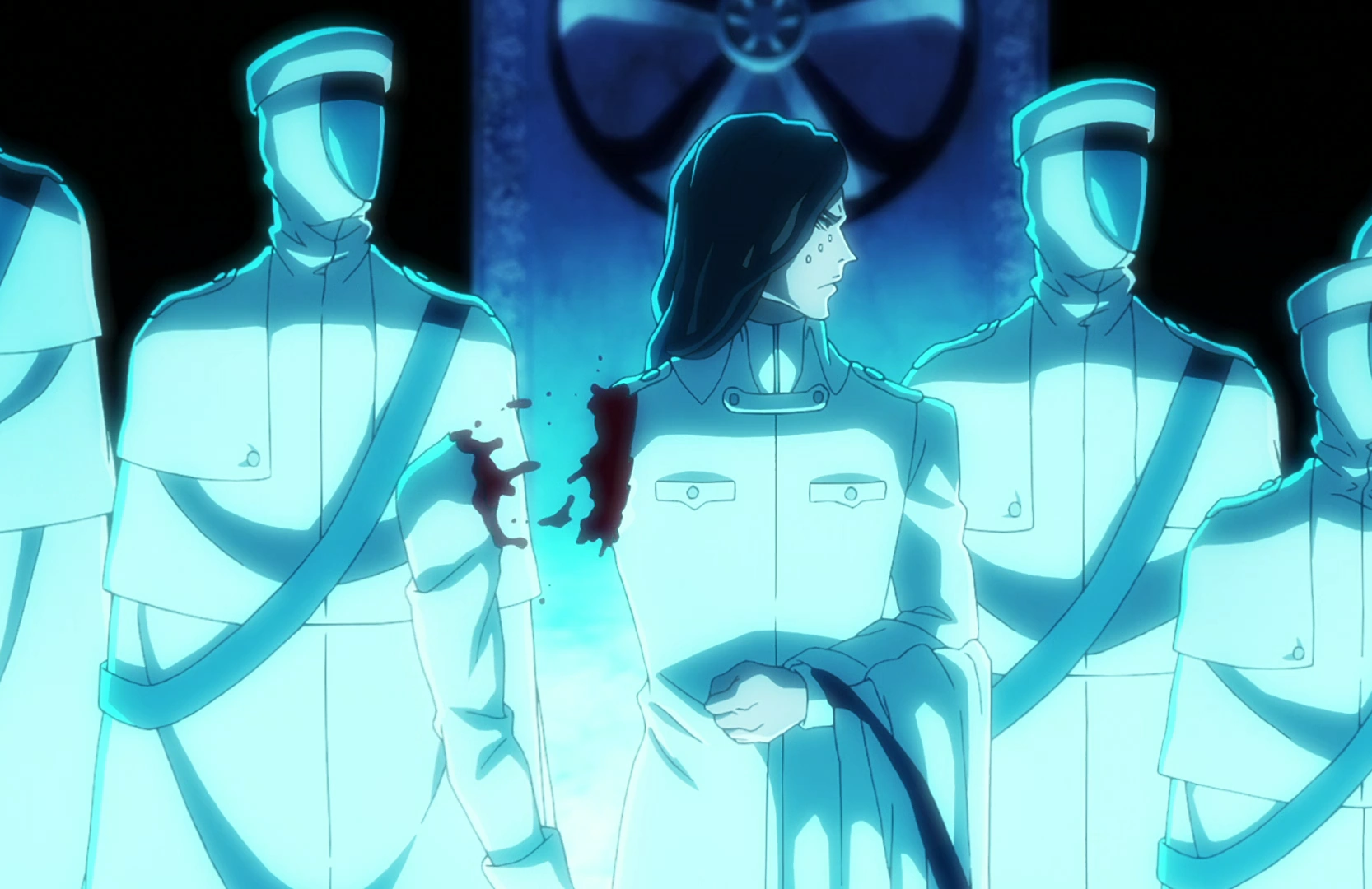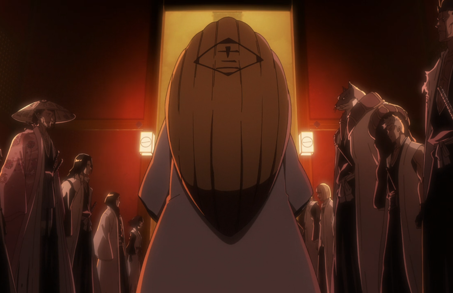 In his office in the Seireitei, Captain-Commander Genryūsai Shigekuni Yamamoto notices a flash of lightning from the Bankai of his lieutenant, Chōjirō Sasakibe,[3] as he finishes receiving reports from the Ninth Division and Eleventh Division prior to the Shinigami reporting to him being decapitated while beginning to deliver the Tenth Division's report. Upon turning around, Yamamoto finds seven masked individuals standing across from him at the other end of the room, where Luders Friegen greets Yamamoto and states that they have come to declare war.[4]