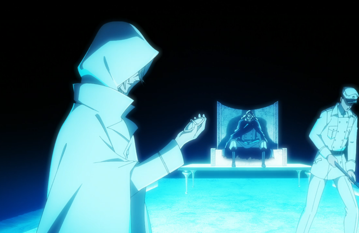 That evening, in a captains meeting in the First Division barracks, 12th Division 3rd Seat Akon finishes delivering his report on the incursion to the assembled captains and is dismissed by his captain, Mayuri Kurotsuchi, who steps in to explain that the Ryoka identifying themselves as the Wandenreich are connected to the recent mass disappearance of Hollows in the Human World, which has caused a great imbalance of Souls and could possible mean the destruction of both the Human World and Soul Society itself, before assuming the captains are astute enough to know the only ones able to erase Souls from the cycle of rebirth are Quincy.[17]