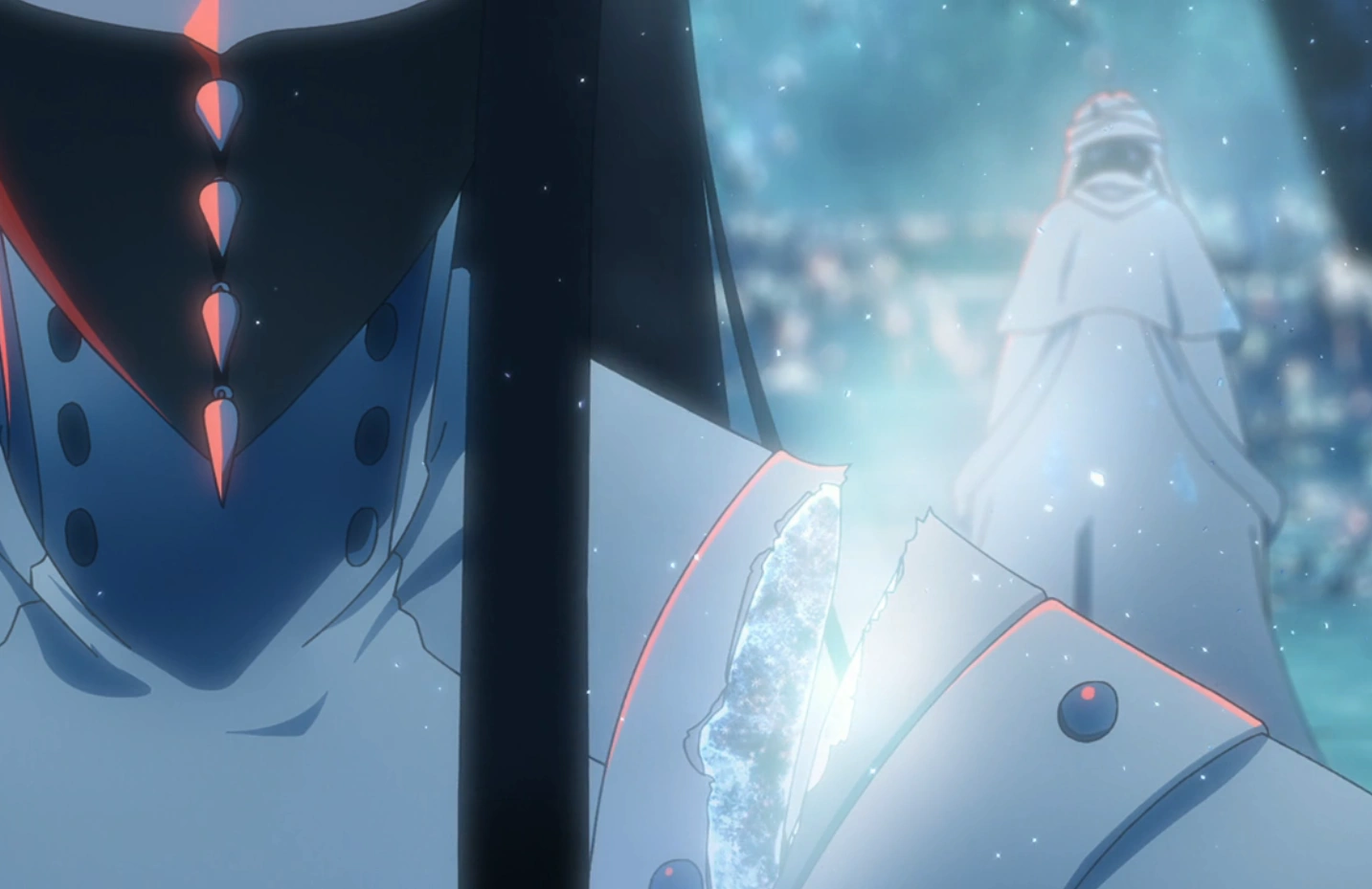Standing in front of Äs' remains in an icy kimono with transparent adornments and light-colored hair, Rukia's hand begins to crack, only for Byakuya to grasp it with his own, causing his fingers to become encrusted with ice, and encourage her to undo it slowly. With Rukia exhaling cold air, Byakuya calls her Bankai magnificent, but warns her that it is perilous and could take her life with a single misstep. After advising Rukia to handle Hakka no Togame with caution and never be impatient with it, Byakuya concludes that nothing can be won by a sword swung in exchange for one's life and invites Rukia to come with him and protect Soul Society, which she accepts.[24]