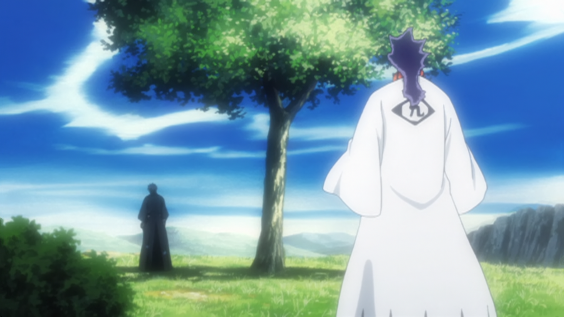 Hisagi and Ukitake converse while watching Orihime and Rukia train.