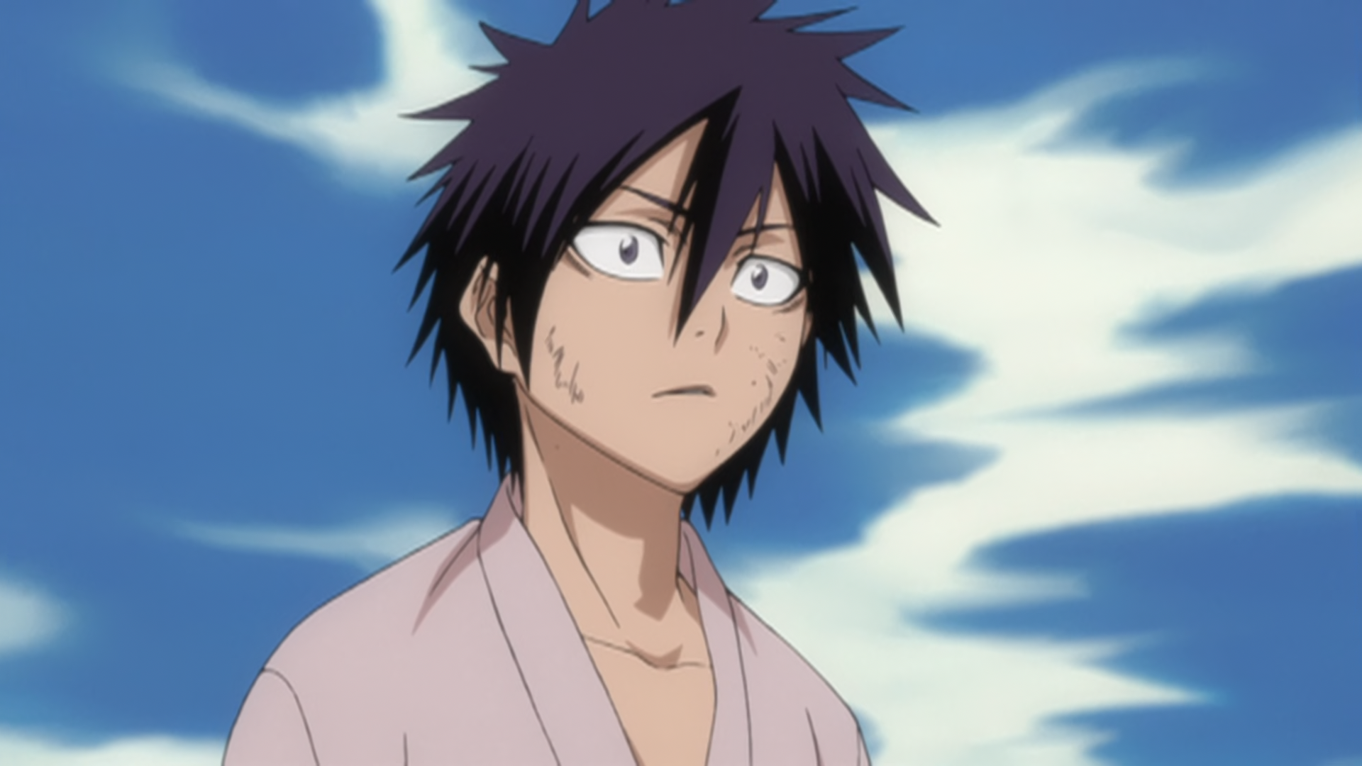 Shūhei Hisagi is a tall and lean-built man with dark grey eyes, short black hair and three scars straight over his right eye that lead down his cheek (gained during a past Hollow attack). Additionally, he has the number "69" tattooed on his left cheek (inspired by Kensei Muguruma, who saved him from a Hollow when he was young), as well as a blue-striped tattoo running across his left cheek and over the bridge of his nose. He wears a choker around his throat and matching armbands on both upper arms. These have explosive properties which he exploited in his fight with Findorr Calius.[3] Hisagi wears a sleeveless shihakushō, and has his lieutenant insignia tied to his left arm. Back when he asked Tōsen to remove him as a seated officer, he wore a Shinigami robe with sleeves and did not have the blue-striped tattoo. During his academy days, Hisagi's hair was much longer, hanging down to his neck in the back and approaching his chin in the front.[4]