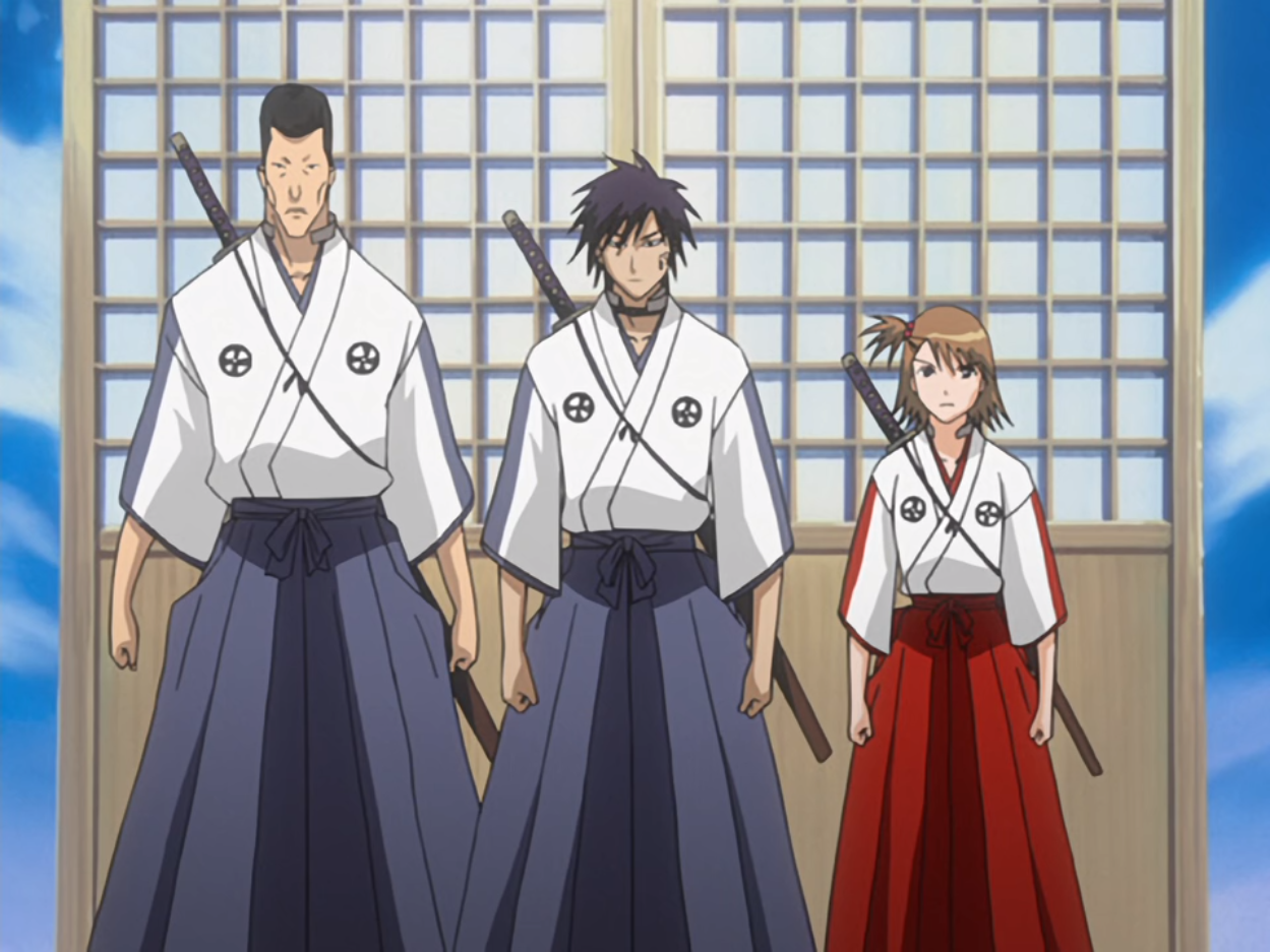 The uniform of the Academy is similar to the standard Shinigami shihakushō uniform, but with a different color scheme. The women's style consists of a red shitagi (under shirt), a white kosode (shirt) with red stripes, red hakama (trousers), white socks and sandals. For the male version of the uniform, the red is replaced with blue.[8] There is a circular symbol on both breasts of the outer shirt. This appears to be the emblem of the Academy.