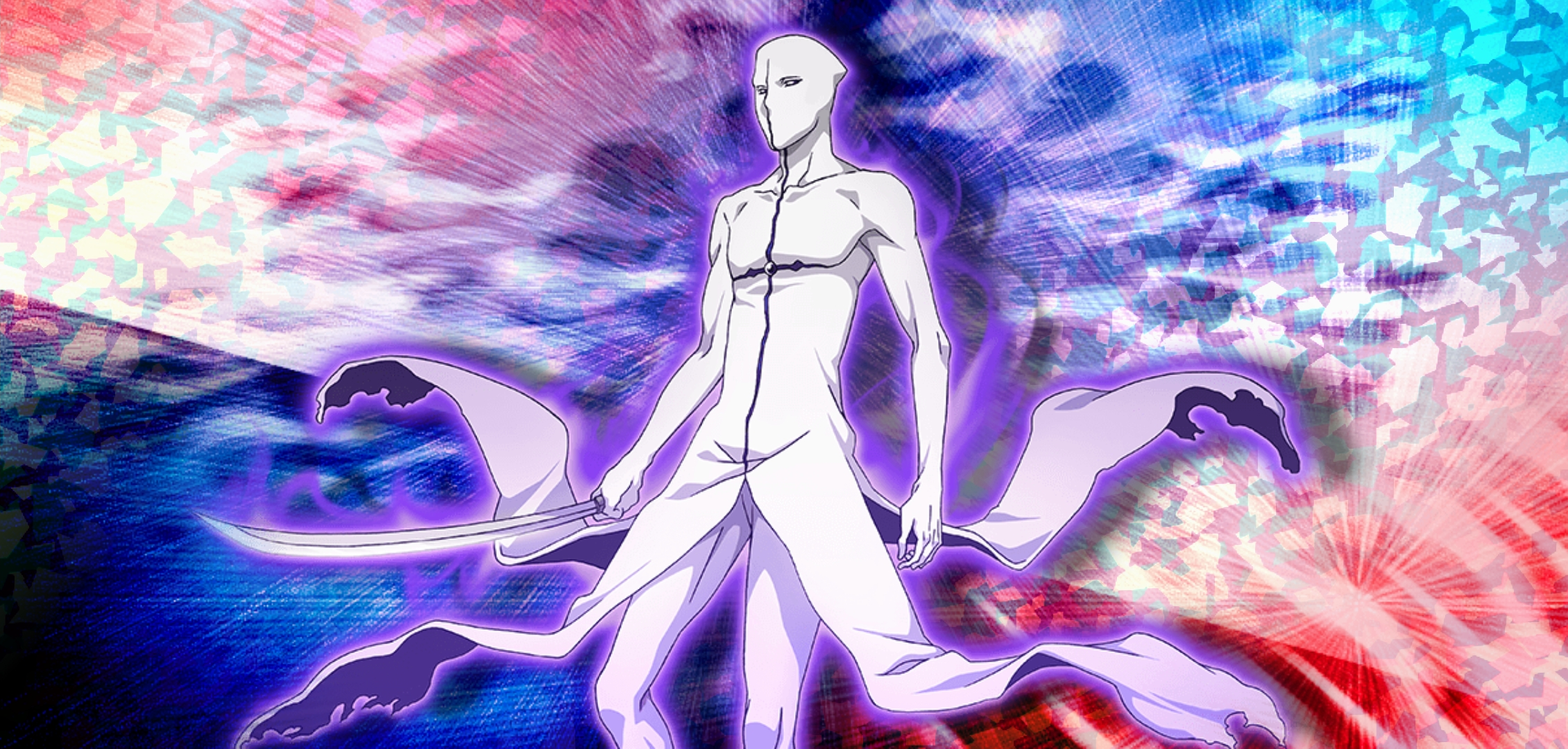 Aizen's Second Fusion: the Chrysalis Stage. Second Fusion (第2の融合, Daini no Yūgō):[327] After having the Reiatsu vents in his wrists sealed and being caught in an explosion of his own spiritual power, Aizen emerges unscathed as an eerie, phantom-like figure.[340] In this so-called Chrysalis Stage (蛹籃の時, Yōran no Toki) of his evolution,[341] Aizen's attire seems to have become part of his body, with a pure-white layer encasing him from head to toe like a full-body suit or cocoon. On Aizen's face only his eyes remain uncovered, now purple and lacking differentiated sclerae, irises, and pupils. The suit fits tightly over Aizen's upper body but loosens below his waist, where it splits into four tails (with the inside visible as black, or purple in the manga). Aizen's legs are also covered in white up to his feet, which resemble heeled boots. The Hōgyoku remains firmly stuck below Aizen's chest, with four purple lines extending from it crosswise, one up to his face.[342] After a brief struggle against Yoruichi Shihōin, Aizen's Zanpakutō becomes fused with his right hand. Under damage, Aizen's white suit will crack and fold like a solid shell,[343] and if an opening is made in it a purple, spectrally glowing substance becomes visible beneath.[344]