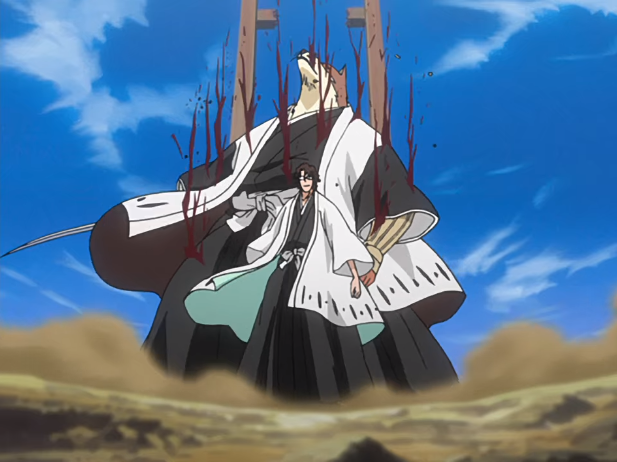 Immense Strength: Aizen's unassuming size belies his physical strength, which far exceeds the average captain's. He easily stopped a charging Ichigo's Bankai blade with an outstretched index finger (though Ichigo was worn out from fighting Byakuya Kuchiki prior) and then nearly bisected the Ryoka with one stroke,[289] leaving him barely held together by his spine.[290] Aizen has caught barehanded the Shikai blades of Renji's Zabimaru (before proceeding to slash it apart)[282] and Komamura's massive Tenken.[284] With one swing from a distance, Aizen was furthermore able to lop off the arm of Komamura's giant Bankai warrior while cutting into its armored chest, before dispatching Komamura directly with a follow-up slash.[279] During his release from Muken, immediately after Shunsui Kyōraku had used a single key to undo the seal on Aizen's mouth, Aizen was able to move freely from his bindings, as well as speak, without any further intervention from Shunsui.[291]