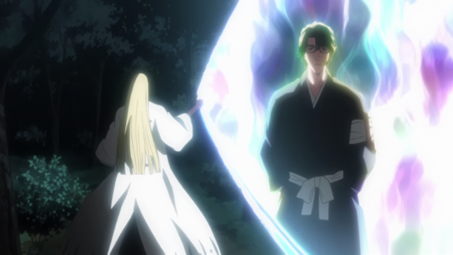 Immeasurable Spiritual Power: Even by captain-level Shinigami standards, Aizen's spiritual power is utterly enormous. Upon explaining that someone with twice a captain's Reiatsu can, via momentary fusion, awaken a dormant Hōgyoku, Aizen proved himself easily capable of said feat.[239] When disposing of Tier Harribel, Aizen boasted that the collective power of all ten Espada was inferior to his alone,[240] and Gin Ichimaru observed that Aizen's unrivaled strength is why the ragtag Espada had been united and subjugated in the first place, before adding that none of the Shinigami could hope to defeat Aizen even if they came prepared for all eventualities.[241] While Aizen himself has declared his power to be without equal in Soul Society,[242] he did at one point concede inferiority to Captain-Commander Yamamoto, citing the latter's extremely powerful Zanpakutō as the reason.[243] Still, Aizen can defeat most of his captain-class opponents without a modicum of effort or being injured, often with singular sword strokes or Kidō spells;[244][245][246] during an 8-on-1 battle against the Gotei and Visored, facing no less than seven current and former captains by himself (two of which were using Bankai), Aizen dispatched all of them single-handedly, in rapid succession.[247][248] After spending a year and a half sealed in Muken, Aizen was sought out by Yhwach as a recruit,[249] with Aizen's enormous Reiatsu leading the Wandenreich to designate him as a Special War Power.[250] Upon his release from prison, Aizen had to be seated in a chair special-made to keep his power in check (confining his Reiatsu to the space around him),[251] and after witnessing the destruction wrought by Aizen's unincanted Kurohitsugi, Urahara surmised that Aizen was now stronger than during his fight against Ichigo.[252] Ten years later, it is revealed that like Yhwach's, Aizen's colossal Reiatsu has been central in keeping the Gates of Hell sealed shut.[253] Aizen's Reiatsu is violet.[254][255]