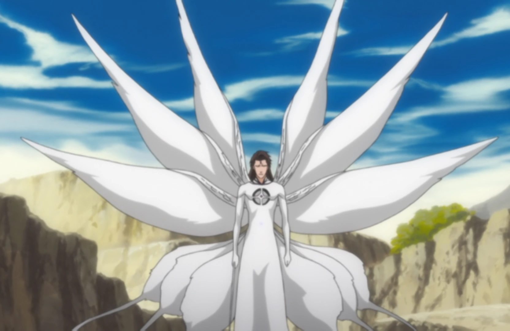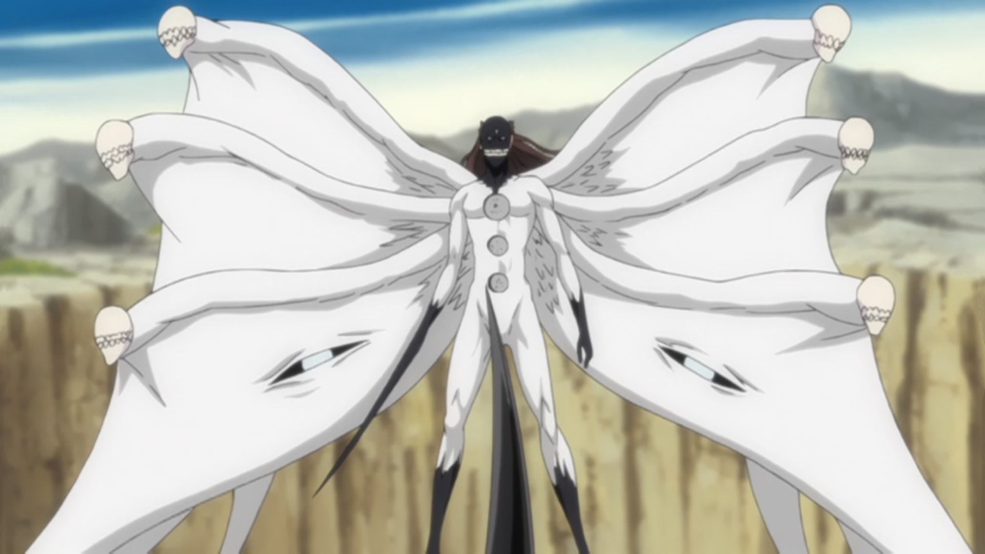 Aizen's Fourth Fusion. Fourth Fusion (第4の融合, Daiyon no Yūgō):[327] After Aizen suffered a fatal blow from Gin's Korose, Kamishini no Yari, which ate a giant hole into his torso,[366] a violet Reiatsu erupts from Aizen's chest and forms a pillar into the sky, which Aizen promptly emerges out of fully healed, now in his Fourth Fusion state;[367] Aizen notes that conquering his fear of oblivion was necessary for his evolution, to become a transcendent being (超越した存在, chōetsu shita sonzai) beyond Hollows and Shinigami.[324] In this Fourth Fusion, Aizen's white robe has become a full-length dress that flares out, ending at his feet in tattered edges, and is still form-fitting above his waist (with a purple-streaked neckline). The irises of Aizen's eyes vanish, as do his eyebrows, a black vesica piscis mark appears in the middle of his forehead, and Aizen's hair (without his signature strand) grows even more. The Hōgyoku is now set into the middle of a white cross upon a gaping, Hollow-like hole in Aizen's chest. Most striking about Aizen's new form are his three pairs of lepidopteran wings, including tailed hindwings,[368] with the forewings becoming pointier when Aizen faces Ichigo.[369] Kyōka Suigetsu remains fused to his right hand.[370]