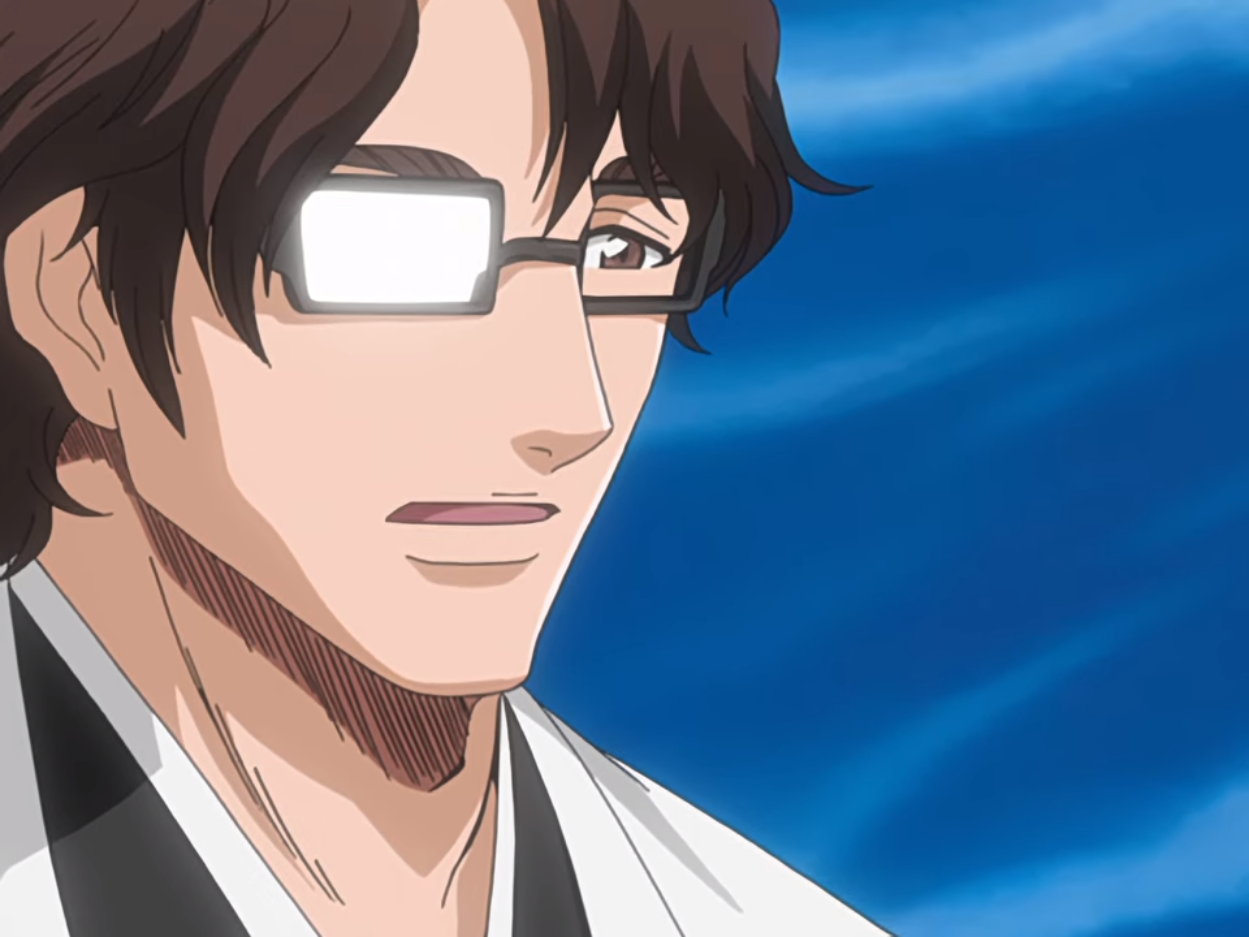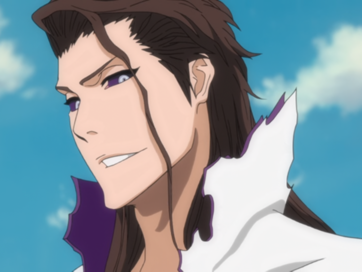 Aizen is a tall, lean man of fair complexion, whose hair and eyes are a similar tone of brown.[note 2] In his original guise as an affable Gotei 13 captain, Aizen kept his hair in a soft, shaggy curtain style and wore black, square-framed glasses, which along with his eyes (slightly droopy at the outer corners) lent him a disarming if not scholarly look. For attire, Aizen donned a standard Shinigami shihakushō with a long-sleeved captain's haori, its inside being a pale turquoise to signify the 5th Division.[3] Over a century ago as a lieutenant, Aizen looked more or less the same as in the present, with the same curtained hair and glasses (but his facial features ever-so-slightly softer); most notable about his attire was the lieutenant's badge around his left arm, with his division's number and insignia upon it.[4]