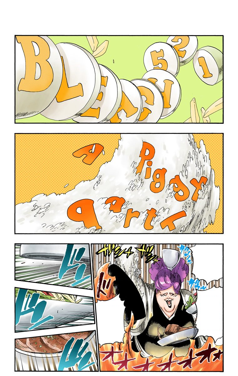 Some time later, with Hikifune detailing how cooking uses up all her Reiatsu and causes her to lose a lot of weight every time, which forces her to remain bulked up most of the time, Ichigo and Renji step out onto the launching platform, where Hikifune warns them to be careful out there and reminds them of her statement about their rituals being packed with the history of Soul Society. Clarifying that each member of the Royal Guard has created something in Soul Society that the Soul King recognized as significantly contributing to its history and which led to them being invited to the Royal Guard to begin with, Hikifune explains that she invented Gikon and the technology to place them into bodies, with Gikongan being created using part of this invention, prior to detailing how the essence of Gikon is to increase one's level of power by infusing them with a foreign Reiatsu and revealing that the food Ichigo and Renji ate was filled with that essence, drastically increasing their Reiatsu, leaving Ichigo and Renji staring at their bodies in shock.