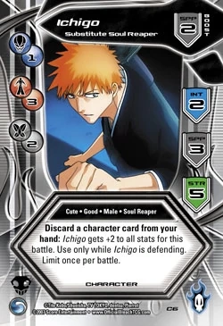 Character cards can represent anyone and anything from Bleach, whether it be Humans, Shinigamis or Hollows. Character cards (and the three other types of cards) have a Cost that needs to be paid upon playing the card. Characters also have Traits, which are keywords that determine if specific abilities can be used. Some characters may also be labelled Non-Unique, which means you can have more than one copy in play at any time. The most important area of a Character card is the right side of the card. Each Character can have up to three Stats which they use to attack and inflict Power damage to the opponent. Some Characters may also have Effects. Characters have a White background.